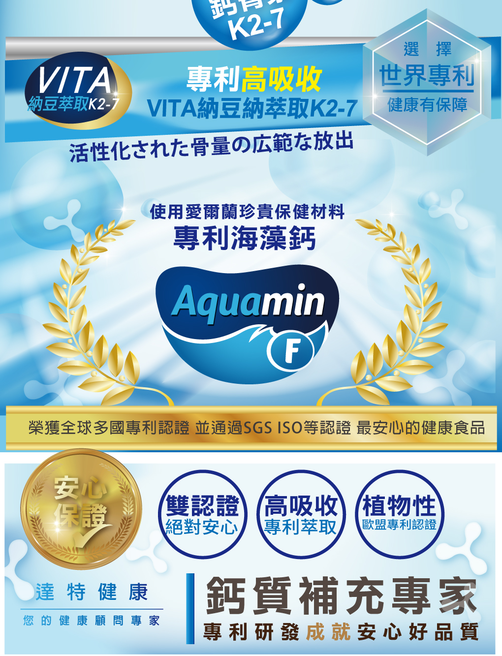 ◆主要成份: 專利愛爾蘭海藻鈣、碳酸鈣、DHA(微藻萃取)、Vita專利納豆菌發酵物K2-7、愛爾蘭海洋鎂、硬脂酸鎂、超微奈米珍珠粉、綜合維生素礦物質(含維生素A、D3、E、C、B1、B2、B6、B12、菸鹼酸、葉酸、泛酸、生物素、鈣、銅、碘、鐵、鎂、鋅、磷)