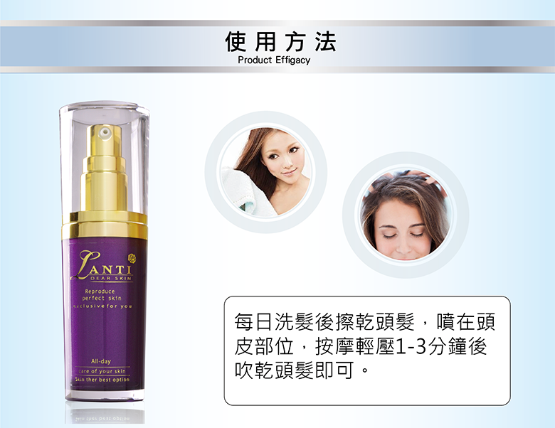 ​‧於頭皮清潔後,直接噴至髮根之部位,並建議按摩約1~3分鐘左右。